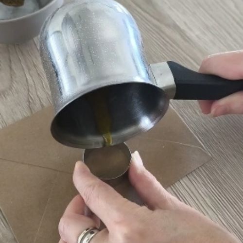 Roztopený vosk nalej dnu - formička udrží vosk “na uzde”, okraje budú pravidelné a okrúhle. - Otlač pečatidlo vo vnútri formičky